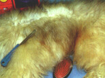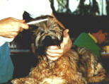 Augensekretstellen auch mit Babyöl behandelt werden, um auf die Dauer dunkle Flecken zu vermeiden. Ein acht Wochen alter Welpe muß noch wenig gekämmt werden. Zweckmäßigerweise geschieht das dann auf einem Tisch mit rutschfester Unterlage. Begonnen wird mit den Beinen von unten nach oben. Dabei steht der Hund überlicherweise. Beim Welpen benutzt man dafür eine nicht zu harte Naturbürste. Die Pfoten, die Haare zwischen den Ballen und besonders zwischen den Vorderläufen werden ebenfalls sorgfältig gebürstet bzw. gekämmt. Zum Bürsten vom Bauch aufwärts zum Scheitel wird das Tier jeweils auf die Seite gelegt. Dabei ist der Welpe für gutes Stillhalten zu loben. Auf keinen Fall darf dabei mit ihm gespielt werden. Er muß lernen, daß diese Pflege einen festen Ablauf hat, die bei gutem Benehmen belohnt wird. Der Kopf mit Bart und Ohren wird im Sitzen gekämmt. Die kleinen Haare im Ohr sollen ausgezupft werden. Nicht zu fest, aber bestimmt wird kurz gezupft. Es tut dem Tier dann nicht weh. Die Rute wird vorsichtig ausgekämmt, um eventuelle Schmutzklümpchen zu entfernen, ohne die empfindlichen Schwanzknochen zu gefährden. Der heranwachsende Hund wird dann schrittweise an den Stahlkamm gewöhnt. Dabei ist immer bis auf die Haut durchzukämmen. Die Bauchpartien bürsten wir aber weiterhin mit der Naturhaarbürste, sofern keine Verfilzungen bestehen. Dabei kann der Hund nun auf den Rücken gelegt werden. Der 12 - 18 Monate alte Junghund muß möglichst täglich durchgebürstet werden, da er dann etwas abhaart. Der Ausgewachsene Hund braucht zur Haarpflege einige Werkzeuge mehr. Diese sind: eine Drahtbürste wie für Menschenhaar, eine feste Naturhaarbürste, ein Metallkamm mit weiten und einen mit engeren Zinken, eine Pinzette und eine scharfe Schere. Über das Vorgehen beim Bürsten und Kämmen gibt es verschiedene Erfahrungen, und jeder entwickelt mit der Zeit seinen eigenen Stil. Wichtig ist, daß keine Stelle im Fell ausgelassen wird und daß der Hund auf den Ablauf eingestellt ist. Zu Beginn und zum Abschluß wird jeweils das ganze Fell, am Kopf beginnend durchgebürstet. Babyöl ist bei der Beseitigung von Verfilzungen z. B. hinter den Ohren oder zwischen den Läufen, zweckmäßig. Das Öl läßt man auf den Filznestern etwas einwirken und zupft sie mit den Fingern auseinander, um sie dann auszubürsten. Niemals darf die volle Zugkraft auf die Haut des Hundes wirken, es bereitet ihm starke Schmerzen, und er wird pflegeunwillig. Sollte sich die Verfilzung nicht lösen lassen, dann hilft nur noch das Herausschneiden der verfilzten Stelle.